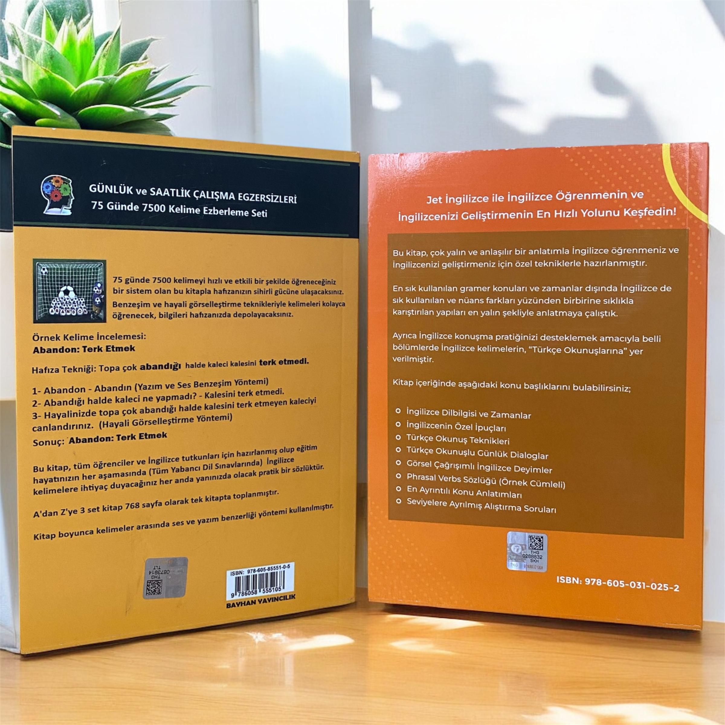 Jet İngilizce ve Hafıza Teknikleri ile İngilizce Kelimeler kitabından oluşan İngilizce Eğitim seti.; Jet İngilizce; Kitabımız İngilizce öğrenmeniz ve ingilizcenizi geliştirmeniz için özel tekniklerle hazırlanmıştır. ; Gramer konuları ve zamanlar dahil İngilizce de sıklıkla karıştırılan yapılar en yalın şekliyle anlatılmıştır.; ; Ayrıca İngilizce konuşma pratiğinizi desteklemek amacıyla belli bölümlerde İngilizce kelimelerin ve cümlelerin "Türkçe Okunuşlarına" yer verilmiştir.; ; Kitabımız toplam 400 sayfa, tek cilttir.; Marka Tescili alınmış bandrollü üründür.; Kitap boyutları 14x20 cm; 2. Hafıza Teknikleri ile İngilizce Kelimeler Bu kitap, tüm öğrenciler ve İngilizce tutkunları için hazırlanmış olup eğitim hayatınızın her aşamasında (YDS, KPSS, LYS-5, TOEFL vb.; sınavlarda) İngilizce kelimelere ihtiyaç duyacağınız her anda yanınızda olacak pratik bir kitaptır.; A'dan Z'ye 3 set kitap, 768 sayfa olarak tek kitapta toplanmıştır.; Kitap boyunca kelimeler arasında ses ve yazım benzerliği yöntemi kullanılmıştır.; Kitabın tamamında her kelime için Hafıza Teknikleri ile kalıcı bir öğrenim ve her kelime için Türkçe okunuşları ayrıca sunulmaktadır.; Her sayfa sonunda ALIŞTIRMALAR kısmı ile öğrendiklerinizi test edebilmeniz ve tekrar etmeniz amaçlanıştır.; Kitabın 75 günlük çalışma programı, YDS sınavına girecek öğrenciler için düşünülmüş ayrı bir detaydır.; 75 günde 7500 kelimeyi hızlı ve etkili bir şekilde öğreneceğiniz bir sistem olan bu kitapla hafızanızın sihirli gücüne ulaşacaksınız.; (Tanıtım Bülteninden) Kitabımız 3 kitabımın birleşiminden oluşan 768 sayfalık tek kitaptır.; Marka Tescilii / Bandrollü üründür.; Kitap boyutları 14x20 cm İki kitapta 1.hamur beyaz kağıttan , 1.kalite baskı ile üretilmiştir.